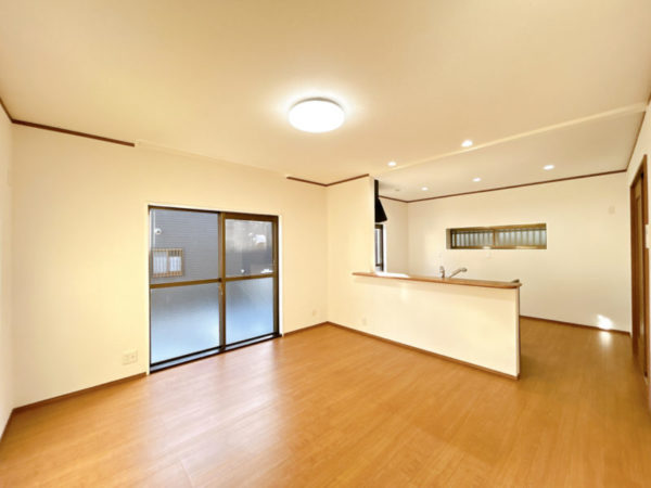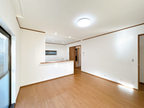 窓からの陽光が心地よいので、家族団欒にぴったりの空間です。天井壁クロス貼り替え、フローリング重ね張り、照明交換、他。